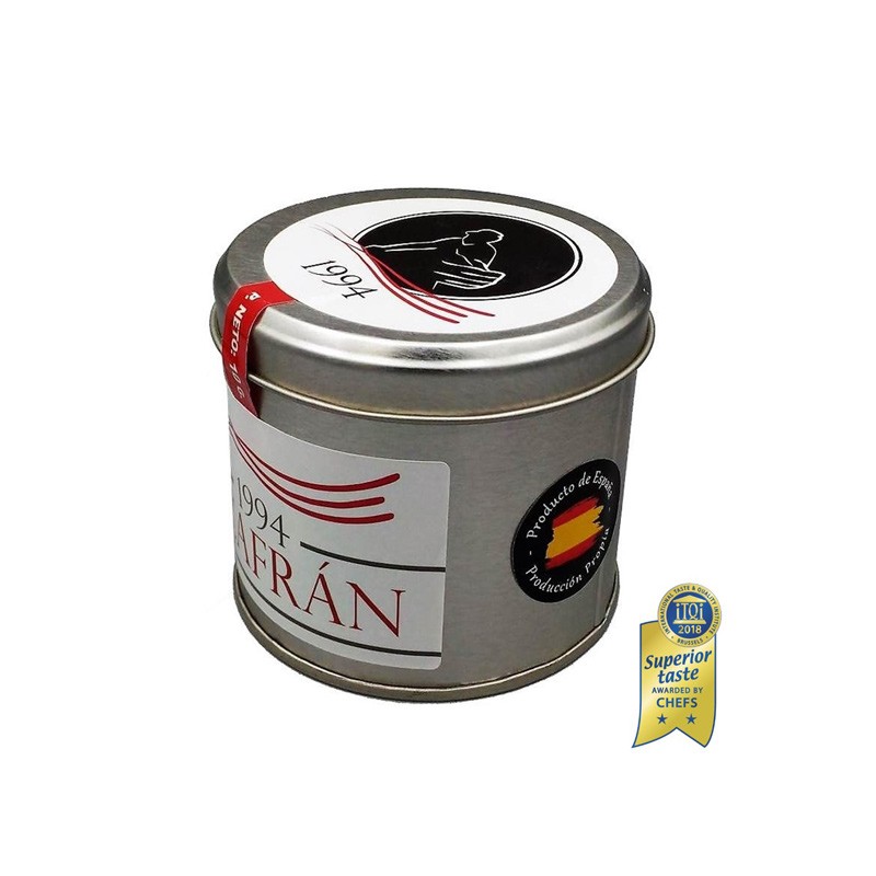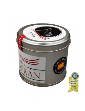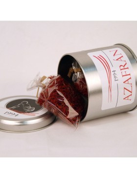 Azafrán Gourmet en hebra presentado en envase metálico redondo. 100% azafrán español de producción propia.