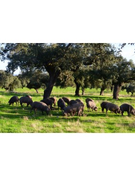 Procedente de cerdos 100% ibéricos mamellado-lampiños, seleccionados expresamente por ser los que mejores características tienen para la elaboración del jamón ibérico. Viven en libertad en nuestras Dehesas del "Baldío" y del "Jaral" cerca de la Sierra de Gata (Salamanca), alimentándose de lo que la naturaleza les proporciona, especialmente la bellota, que comen durante los casi 4 meses de montanera de los que disfrutan. Cada cerdo disfruta de aproximadamente 3 hectáreas para el solo.